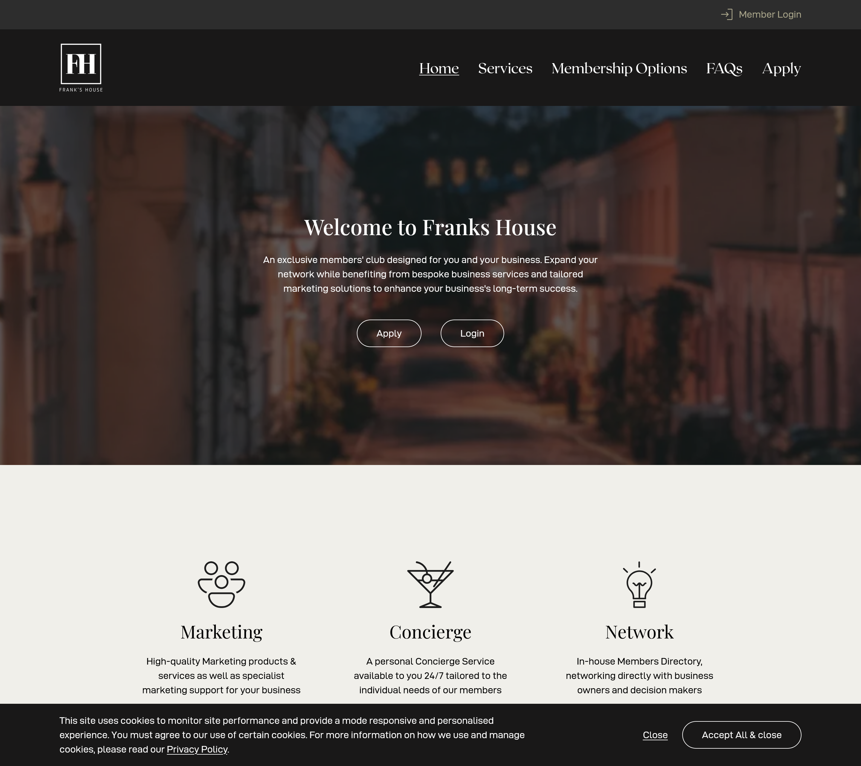The official website for Frank's House, a UK-based exclusive members’ business club and support platform offering bespoke business services, marketing support, networking opportunities, and concierge assistance tailored to companies and entrepreneurs.